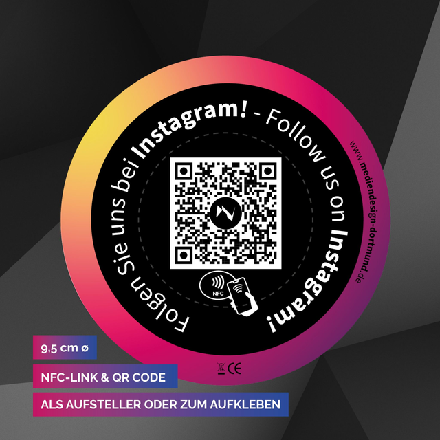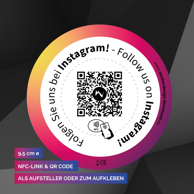 Das ist die smarte Lösung um Besuchern Ihr Instagram Profil zu präsentieren. Der Besucher hält sein NFC-fähiges Smartphone einfach in den runden Bereich der Karte oder fotografiert den QR-Code, automatisch öffnet sich der Link zur Instagram Seite. Der Besucher, muss dann nur noch auf "Folgen" klicken. (Instagram Profil vorausgesetzt)